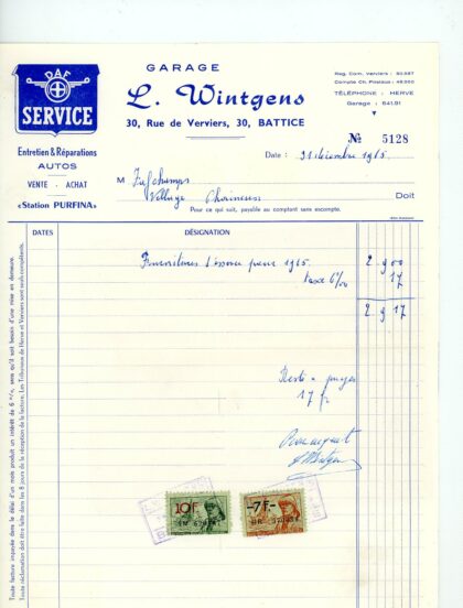 BATTICE – 1965 – 1974 – factures: garage L.WINTGENS (1965) et N.WEICKMANS – CHAPELIER (1974)
