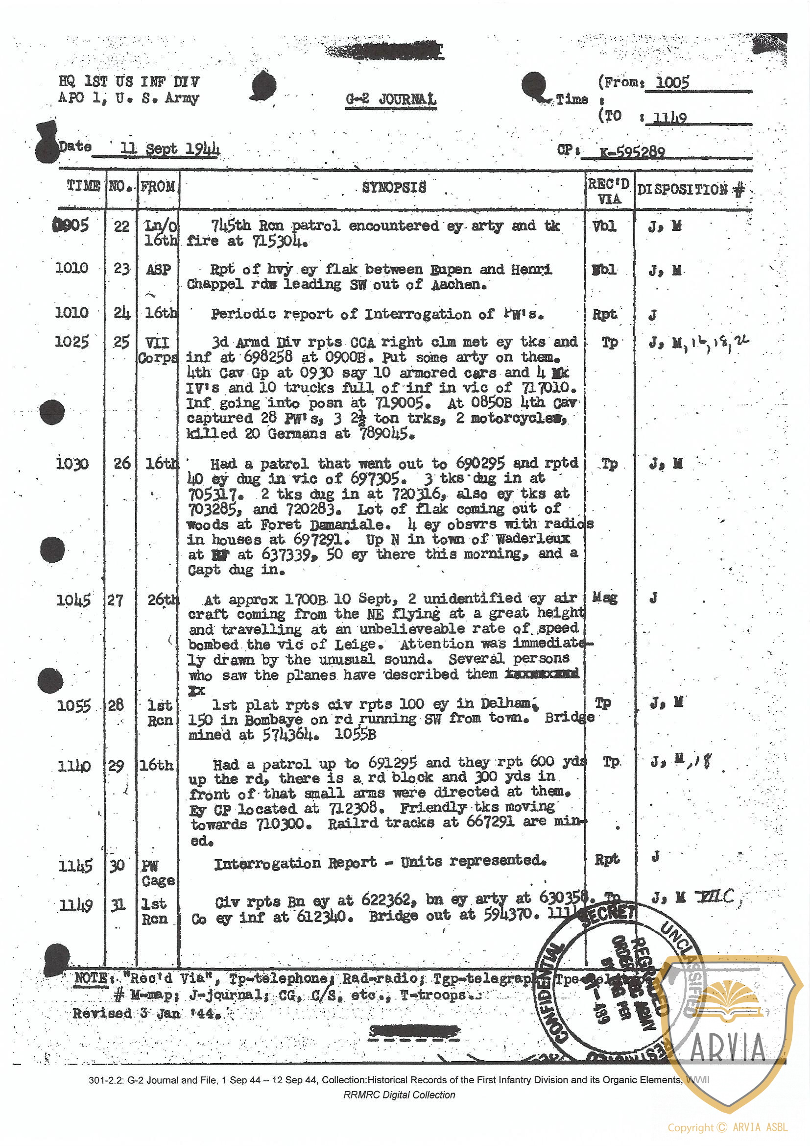 09h40 : le 980th FA informe qu’il a tiré 3 coups de canon sur l’Allemagne. (Il s’agit des premiers coups de canons tirés par l’US Army sur l’Allemagne)