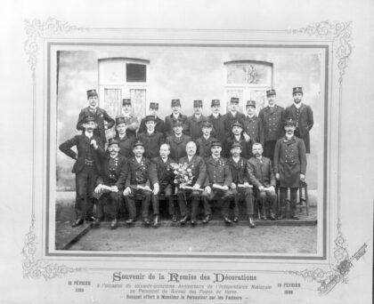 Assis de gauche à droite : Henri Leruth, Mr Hermau, Pierre Pirnay, Mr Lecoq (Percepteur), Mr Donnay, Mr Mathieu, ??? Première rangée de facteurs debout – de gauche à droite : Mr Mathieu, Alphonse Billet,voir la suite…