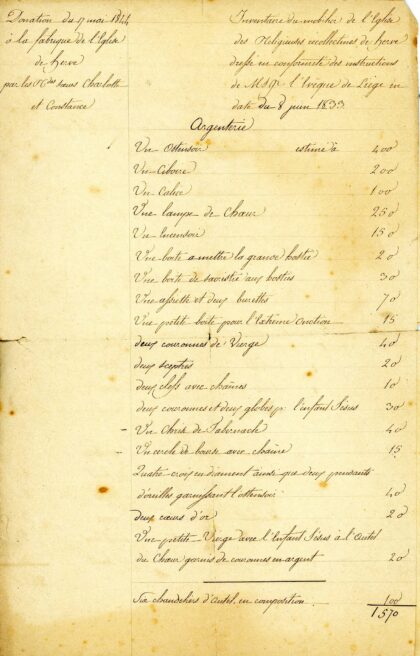 2 photos Dons HERVE -1844 – Couvent St François – don à l’église de Herve par les Religieuses Donation à la fabrique d’église de Herve par les sœurs Récollectines, inventaire du mobilier de l’église.