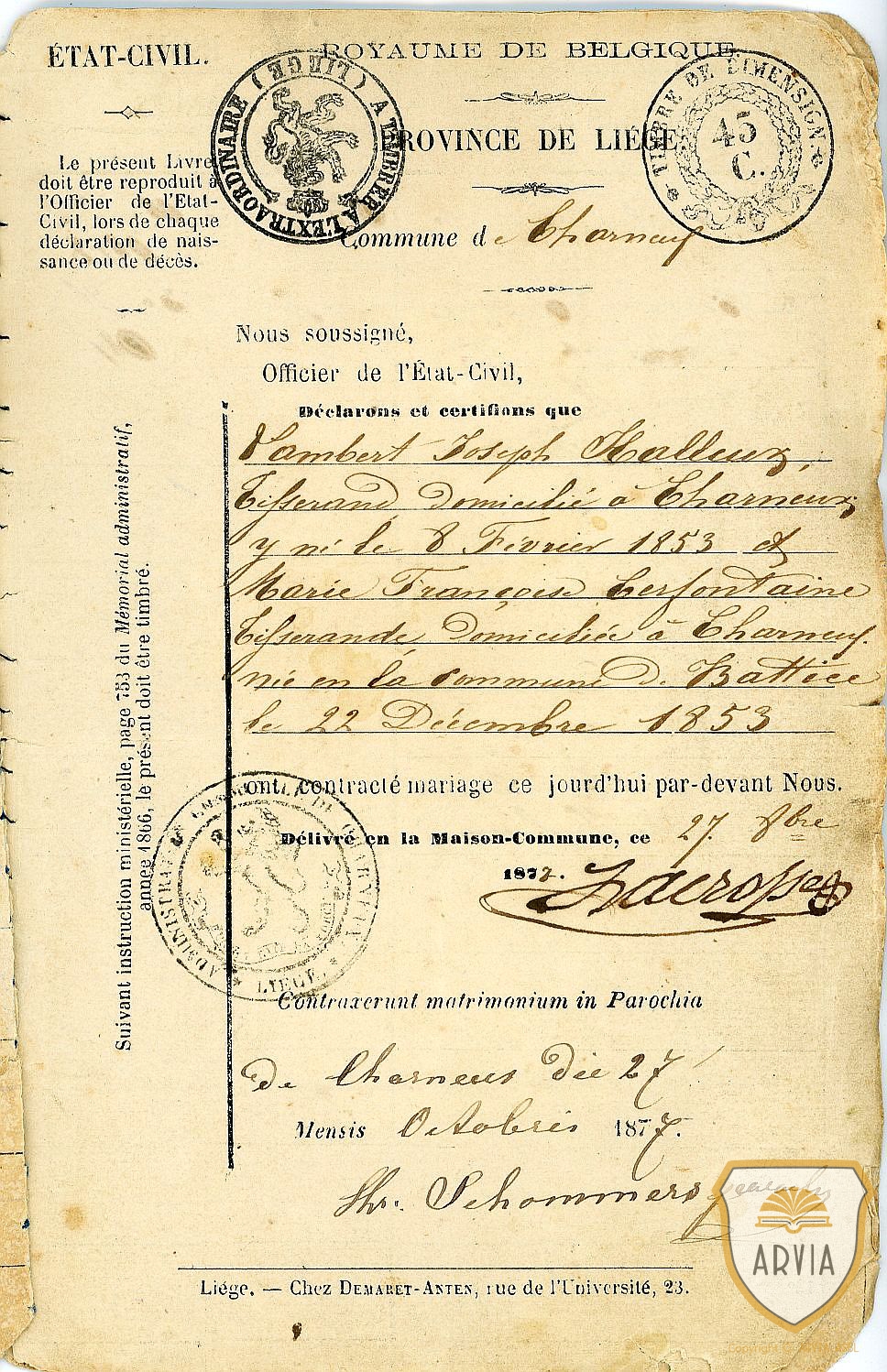 CHARNEUX – 1877 – Lambert Joseph HALLEUX – Livret de Mariage