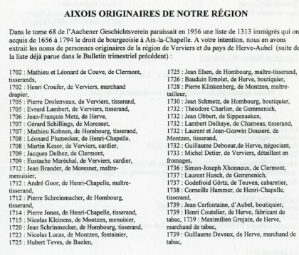 Dans le Tome 68 de l’Aachener Gerchichtsverein de 1956 – liste d’immigrés originaires de la région de Verviers et du Pays de Herve, qui ont acquits de 1656 à 1794 le Droit de Bourgeoisie àvoir la suite…