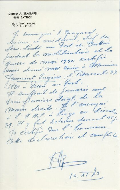 Pendant la mobilisation e 1940 je certifie avoir donné des soins à Eugène Jaminet à trois doigts…. (Dr. Bragard )