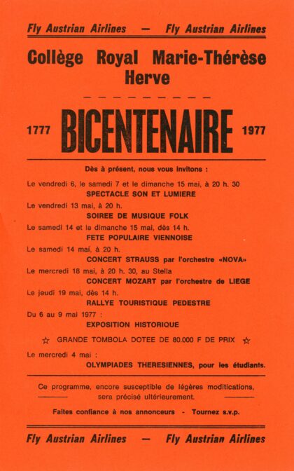 3 photos AutocollantProgramme HERVE – 1977 – Collège Royal Marie-Thérèse : Bicentenaire du Collège – premier timbre