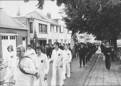 la clique : Pierre Sohet avec le cor,derrière lui Robert Leuwer,Adelin Levêque,Freddy Loncin,au centre Alex Brahim,et derrière Alex,Albert Doudelet – Les pompiers : Lucien Kroonen , Michel Lhoest