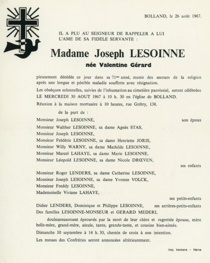 4 photos arbre généalogiqueFaire-Part Mortuaire BOLLAND – 1967 – CORMAN – LESOINNE – BRUWIER – 4 faire-part de 1966 à 1970 – Généalogie