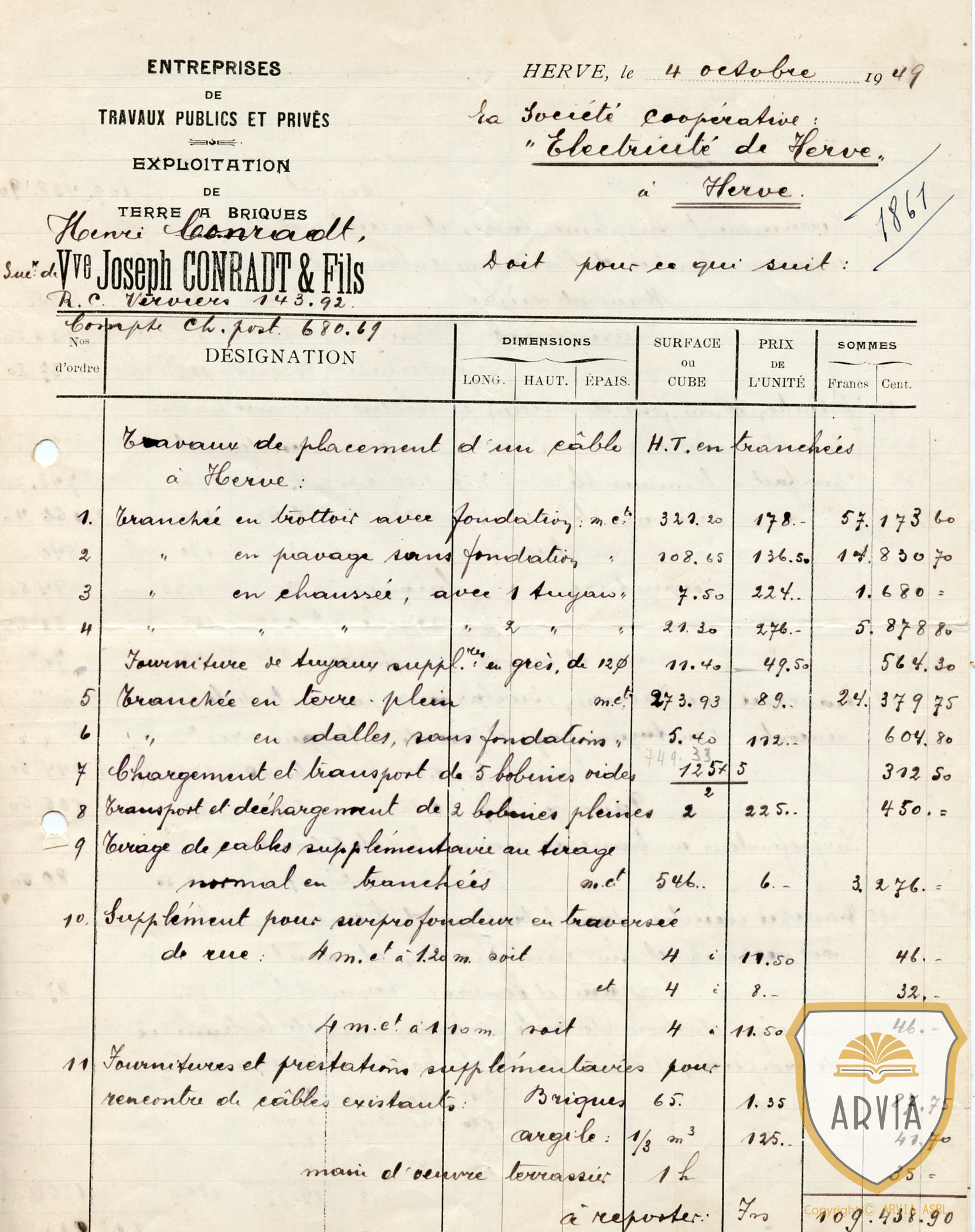 Factures HERVE-Electricité de HERVE-1949 10 4 -Facture Henri CONRADT-Successeur de Vve -Joseph CONRADT et Fils, à L’Electricité de HERVE
