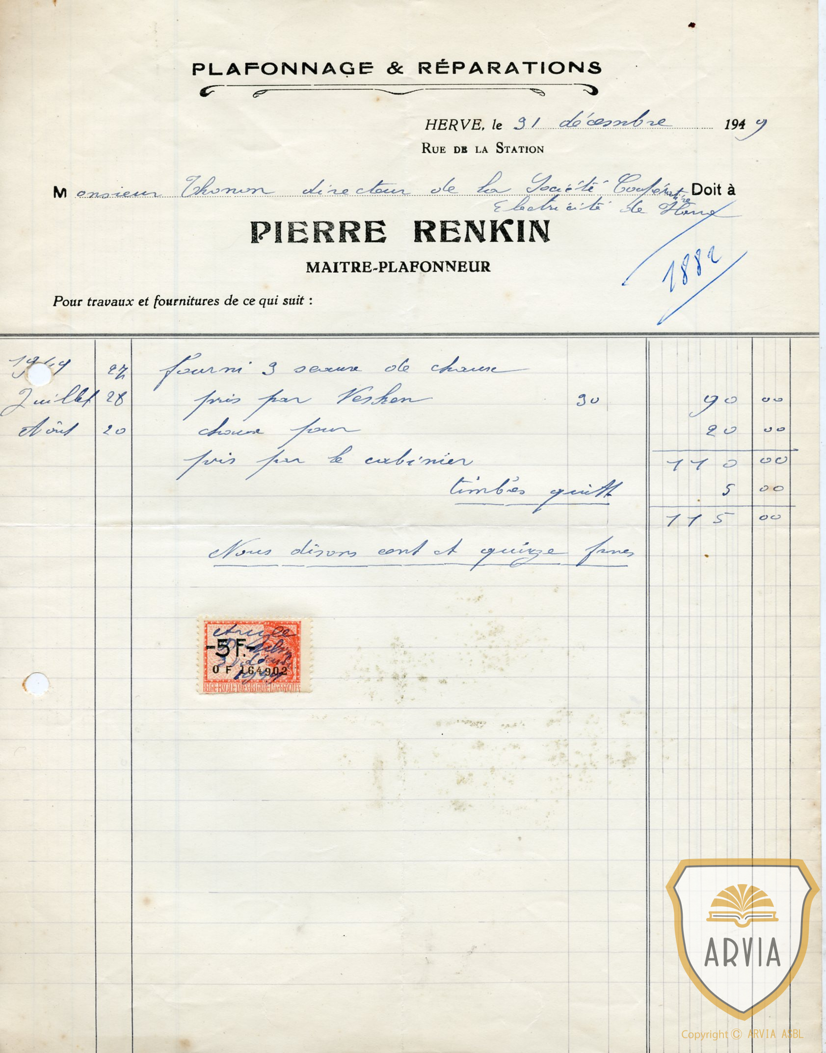 Factures HERVE-Electricité de HERVE-1949 12 31-Facture Pierre-RENKIN-Maître-Plafonneur à La Société d’Electricité de HERVE