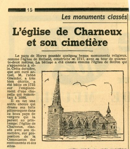 CHARNEUX – 1967 – église en restauration sera bientôt ouverte au Culte – Entreprise LIEGEOIS Frères