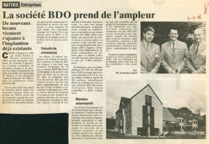 Coupure de presse BATTICE – 1996 – Société » BDO » créée à Battice en 1986 par André Kilesse et Michel Grignard… B.D.O. une entreprise composée de Réviseurs d’Entreprises , d’experts comptables, juristes etc…