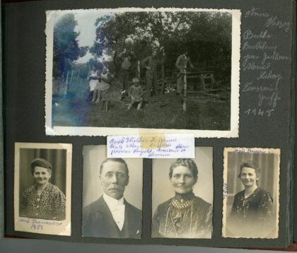 Grande photo: 1945 Anna HOSSAY avec enfants – 1952 tante Françoise – oncle Walther LESOINNE, tante Marie DELFOSSE + Léopold