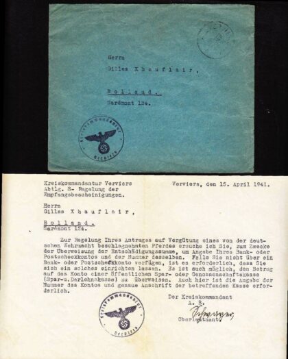 À Monsieur Gilles Xhauflair, Bolland.Sarémont 124. Kreiskommandantur Verviers (Commandement militaire de district Verviers) Sect. S – Règlement des attestations de réception.Verviers, le 15 avril 1941. Afin de régler votre demande d’indemnisation pour un cheval réquisitionnévoir la suite…