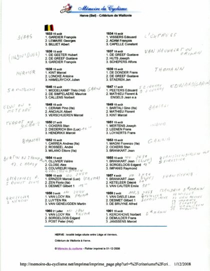 HERVE – 1933 – Critérium de Wallonie – palmarès complet de 1933 à 1961