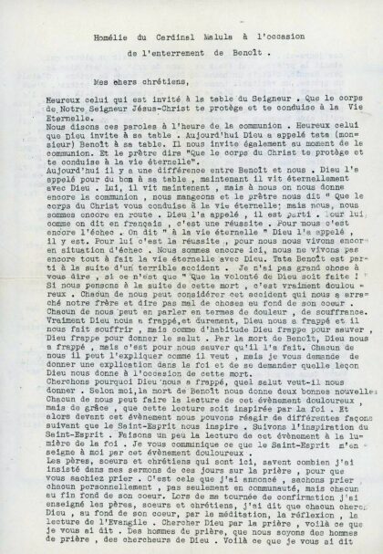 BATTICE -Kinshasa – 1974 – homélie par le Cardinal MALOULA à l’occasion de la mort de Benoît Bragard