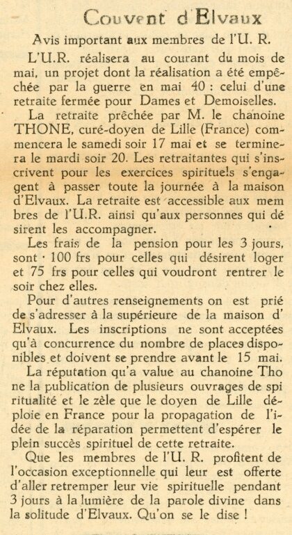 BRUYERES – 1947 – Couvent d’Elvaux – spiritualité – Prêchée pas un chanoine français