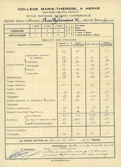 Document HERVE ± 1935 – Collège Marie-Thérèse – M.BARTOLOMEUS – école moyenne » section commerciale «
