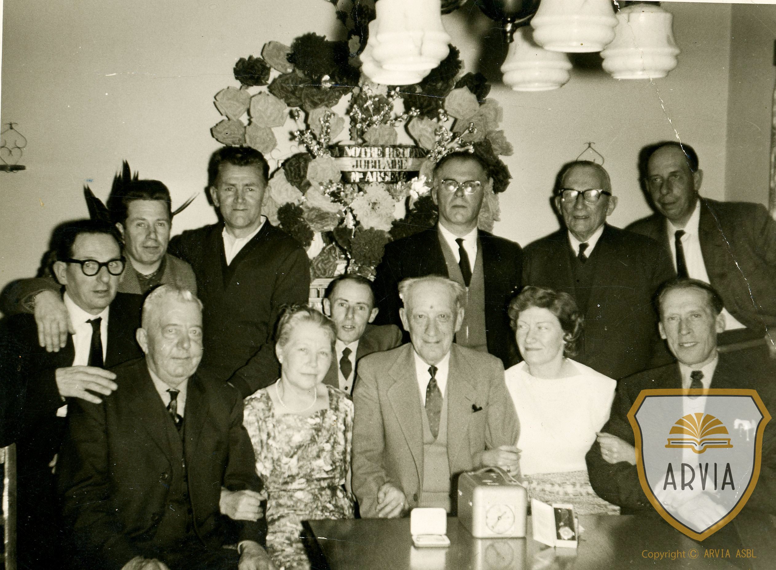 Je crois reconnaître assis au premier rang, Arsène Toussaint. Il habitait rue de Maestricht juste à côté de chez mes parents. A sa droite son épouse et à sa gauche, sa fille Josette. Derrière Arsène, il y aurait en effet Victor Vaessen. Jean Kroonen (le père du docteur) Si c’est cela, je situe plus la photo dans les années 50. L’homme debout à droite pourrait être Jules Rosenholtz, qui habitait rue du Centre à côté de l’ancien cercle. Je ne suis pas certain. Le petit Monsieur à droite d’Arsène Toussaint est à mon avis Gérard Paulus, oncle de Léon Paulus, comptable rue de Herve. ( Ghislain Xhonneux )
