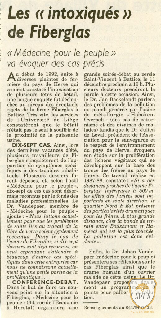 BATTICE – 1992 – Les intoxiqués de FIBERGLAS  » médecine pour le Peuple  » va évoquer des cas précis…