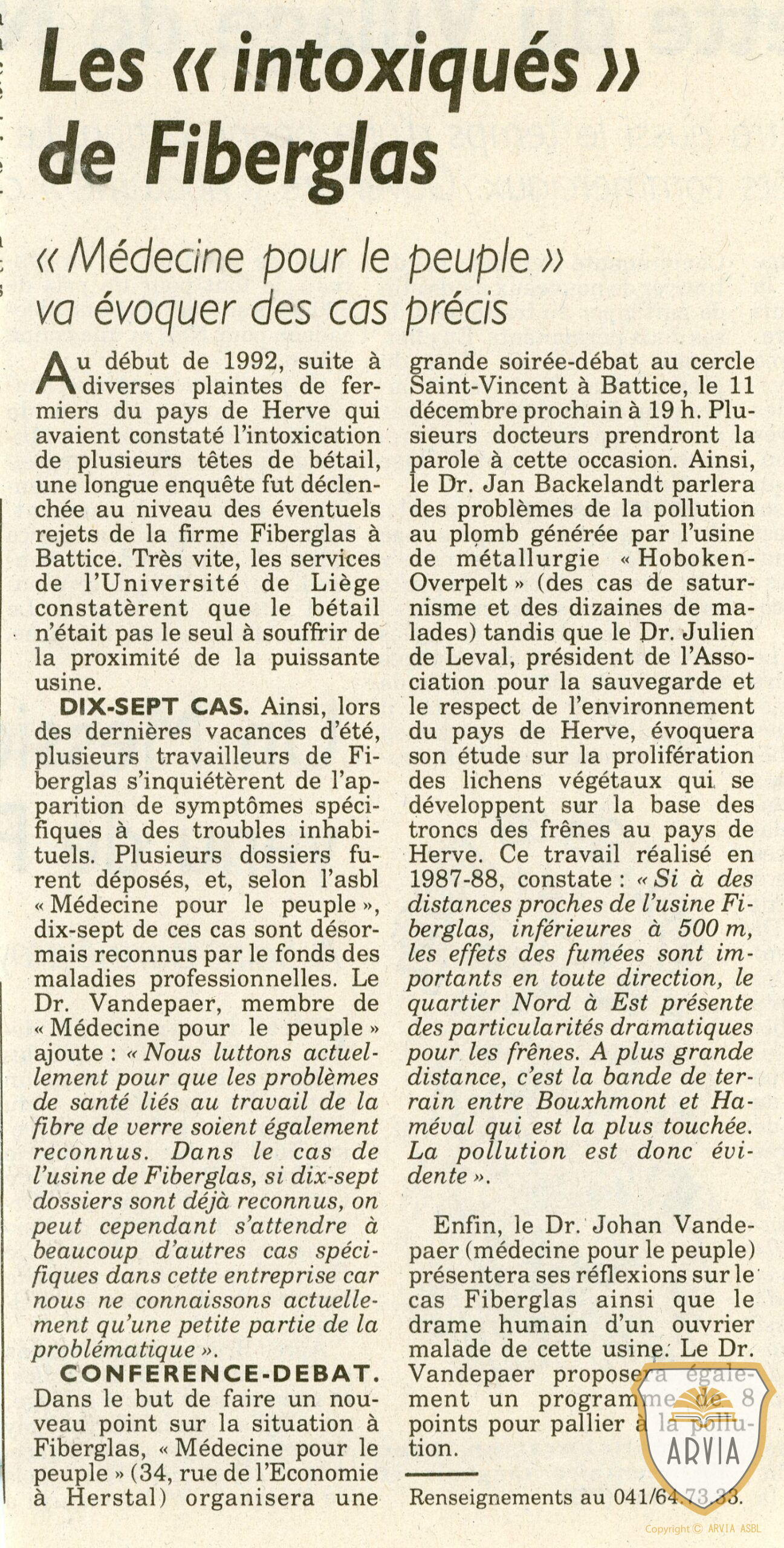 BATTICE – 1992 – Les intoxiqués de FIBERGLAS » médecine pour le Peuple » va évoquer des cas précis… 17 décembre 202517 décembre 2025 Jean-Marie Doppagne Diverses plaintes des fermiers des environs, avaient invoqué l’intoxication de plusieurs têtes de bétail….lire la suite sur l’extrait du journal ci-contre….