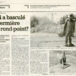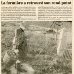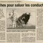 Quelques temps après l’inauguration du carrefour de l’autoroute, avec la fermière et les vaches fabriquées par l’artiste Robert ALONZI, des petits malins n’ont pas trouvé mieux que de coucher son habitante au sol . Nouvelle photo de sa reconstitution par l’ami Alonzi.