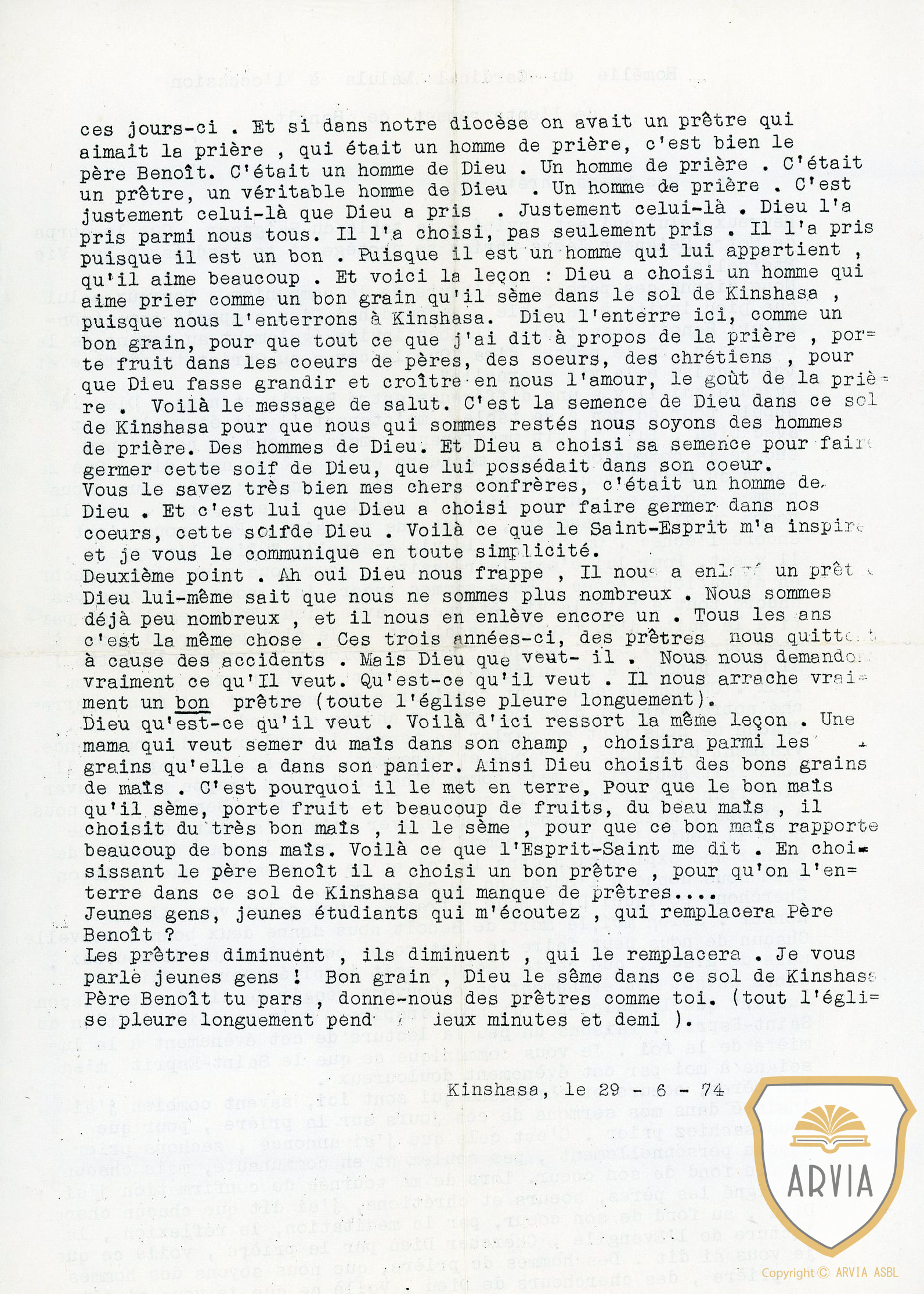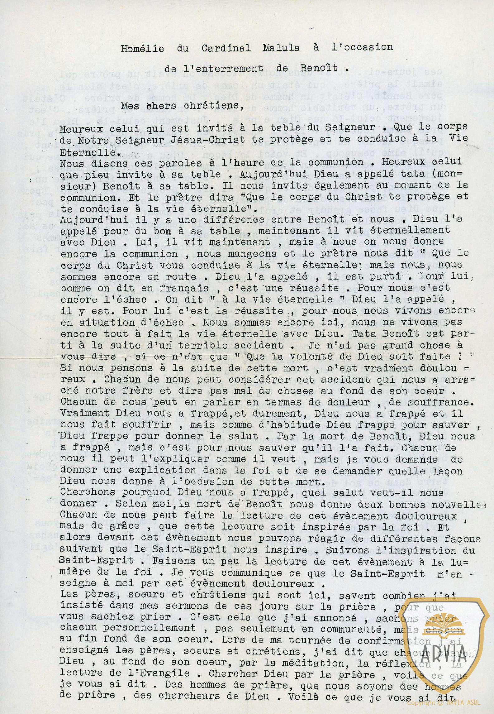 BATTICE -Kinshasa – 1974 – homélie par le Cardinal MALOULA à l’occasion de la mort de Benoît Bragard