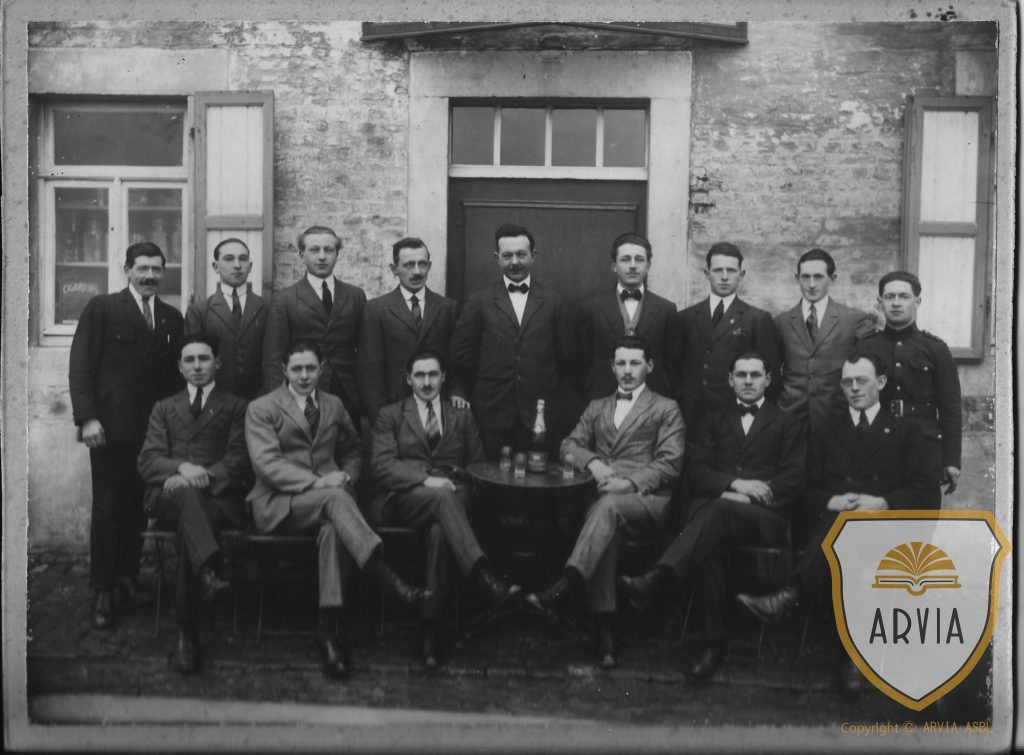 Assis: Armand Toussaint, Joseph Meurens du quartier du Privot, Henri Meurens, Jacques Hogge de Rosmel, ? Dehayes, Eugène Colette.