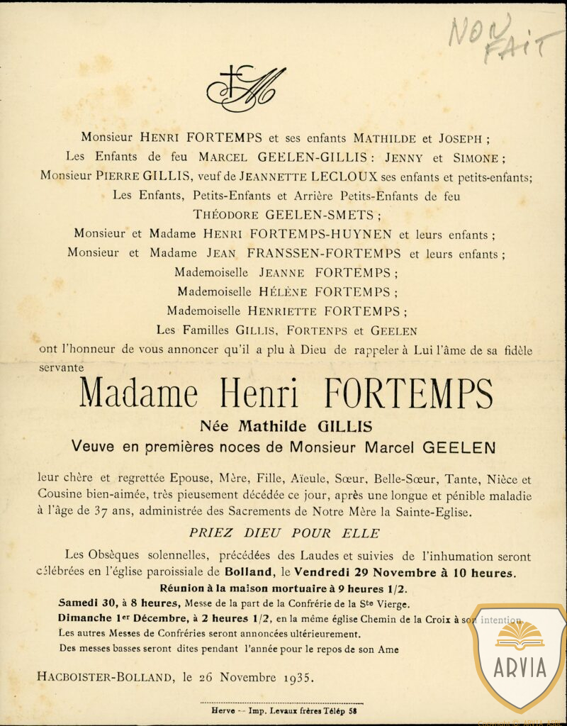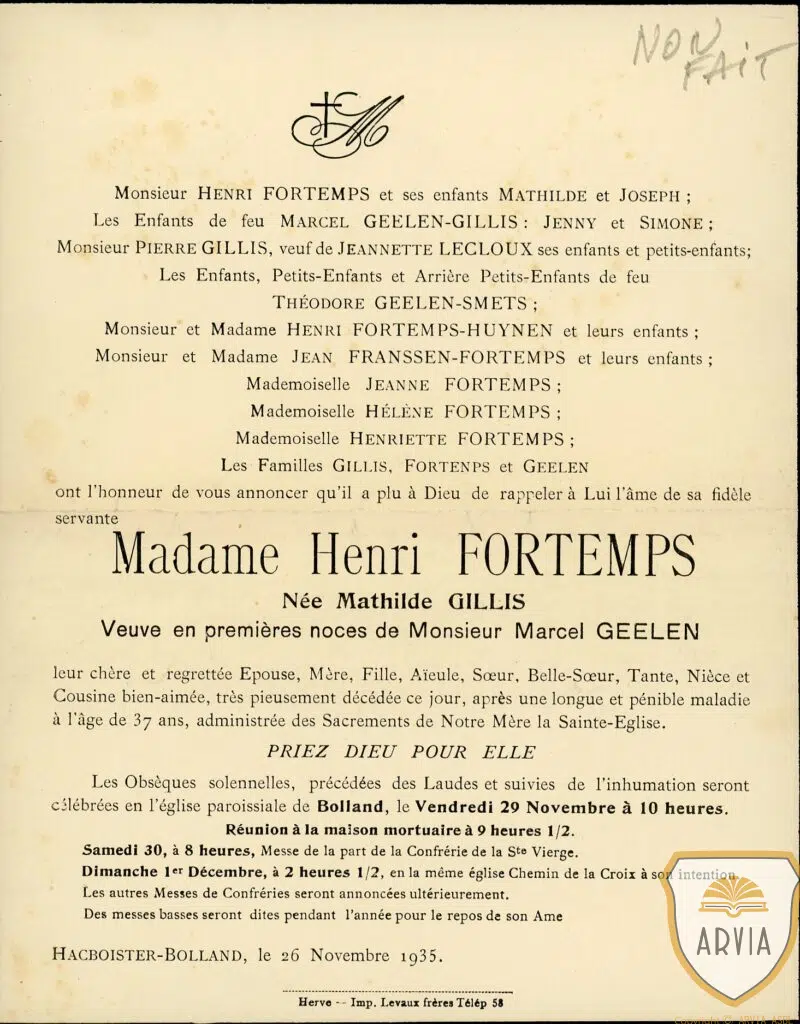 BOLLAND – Hacboister – 1935 – Madame Henri FORTEMPS née Mathilde GILLIS – mortuaire – généalogie 9 mars 2026 Jean-Marie Doppagne