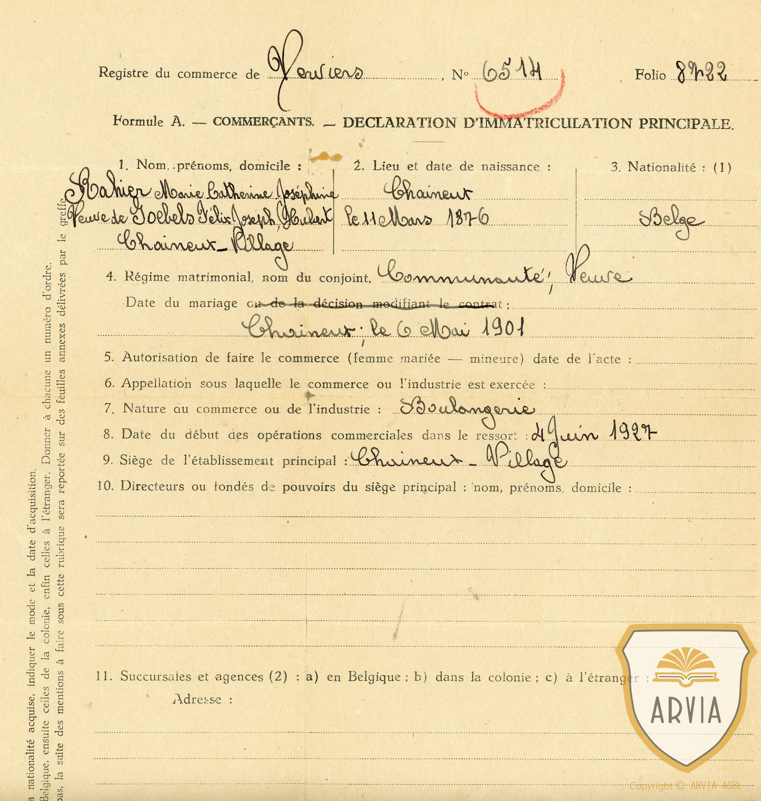 CHAINEUX – 1927 – RAHIER Marie Cath. vve de Félix GOEBELS – déclaration d’immatriculation de commerçant 4 mars 2022 Jean-Marie Doppagne Autorisation de faire le commerce de boulangerie.