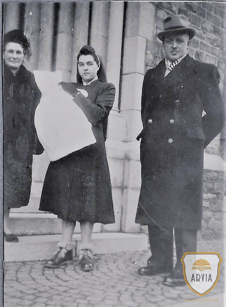 CHAINEUX-1951-Baptème de Robert Lonneux sur les bras de Marie Jeanne Geron accoucheuse, Mariette Demoulin (marraine) et Octave Lonneux(parrain) 4 janvier 20222 janvier 2022 Henri Balhan