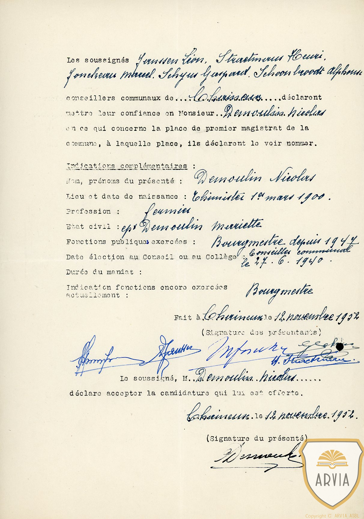 CHAINEUX – 1952 – Nicolas DEMOULIN – nouvelle fonction, nomination comme Bourgmestre de la commune 22 janvier 2026 Jean-Marie Doppagne
