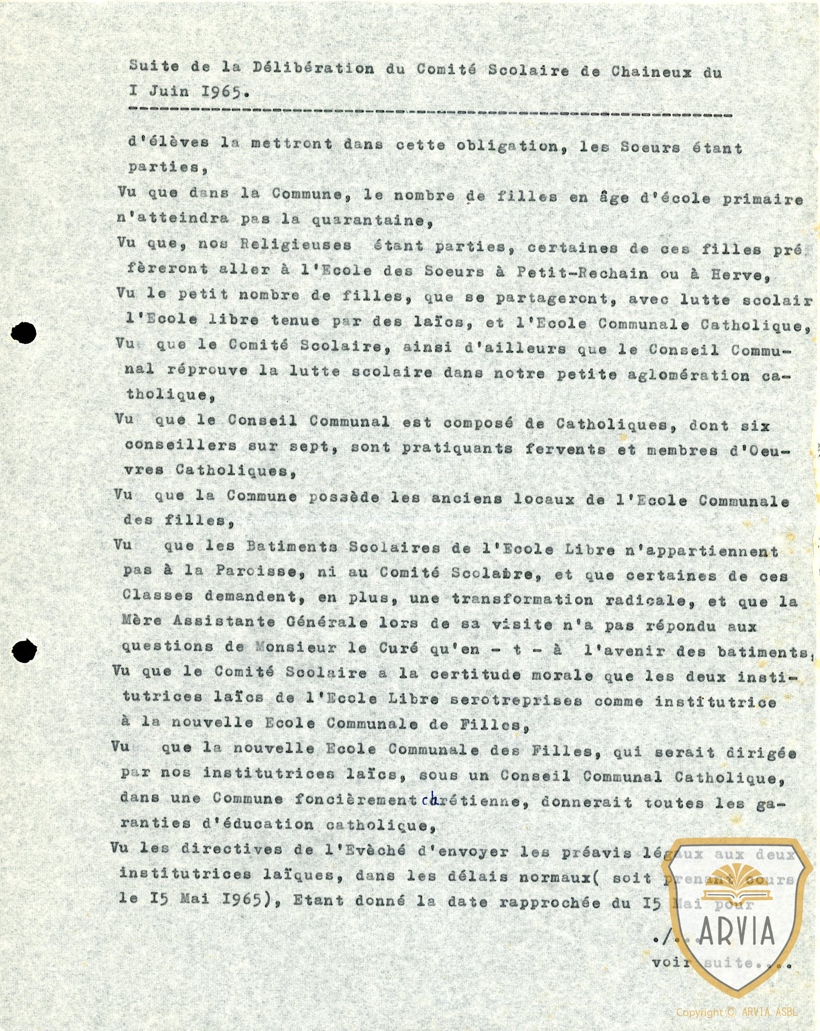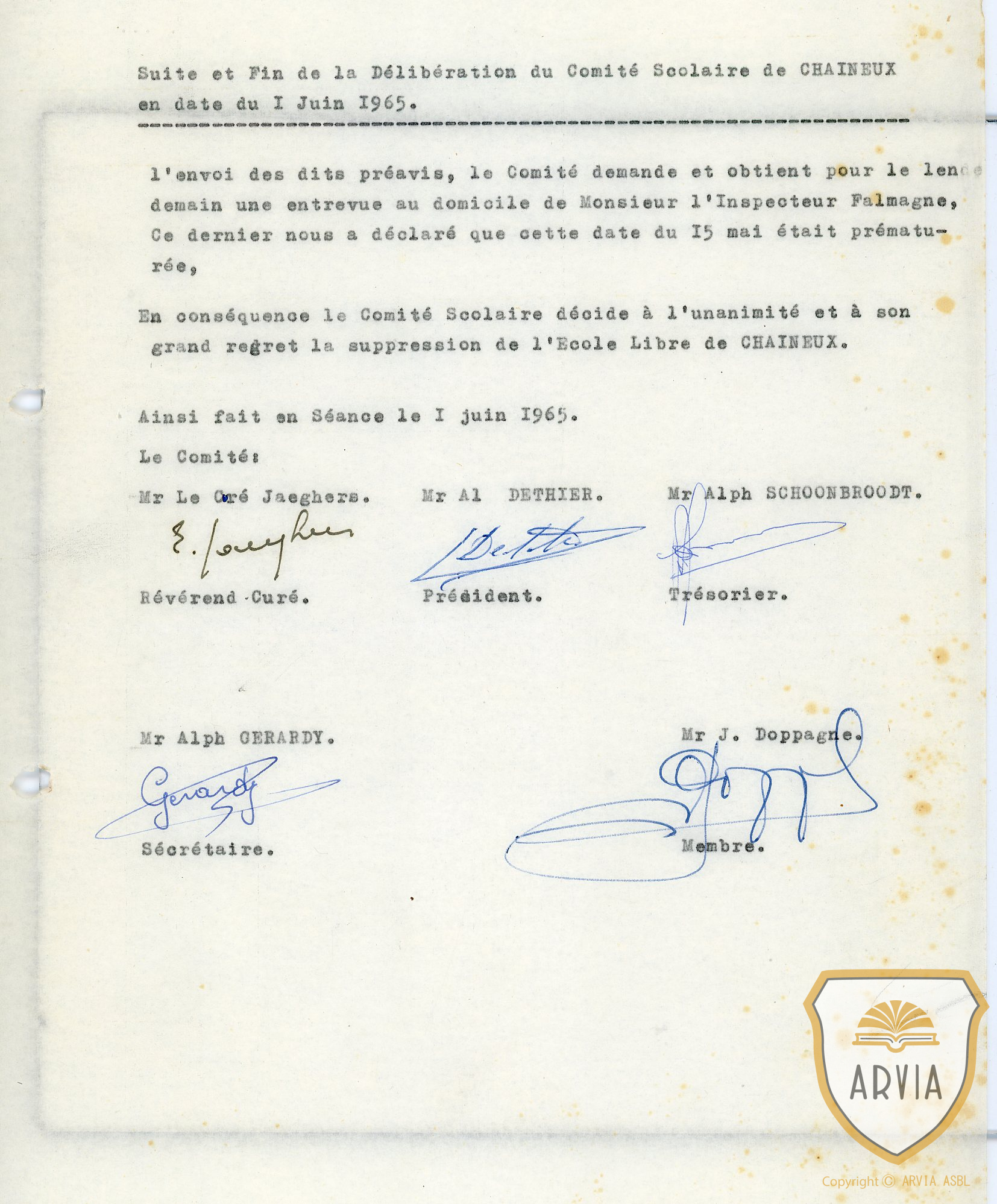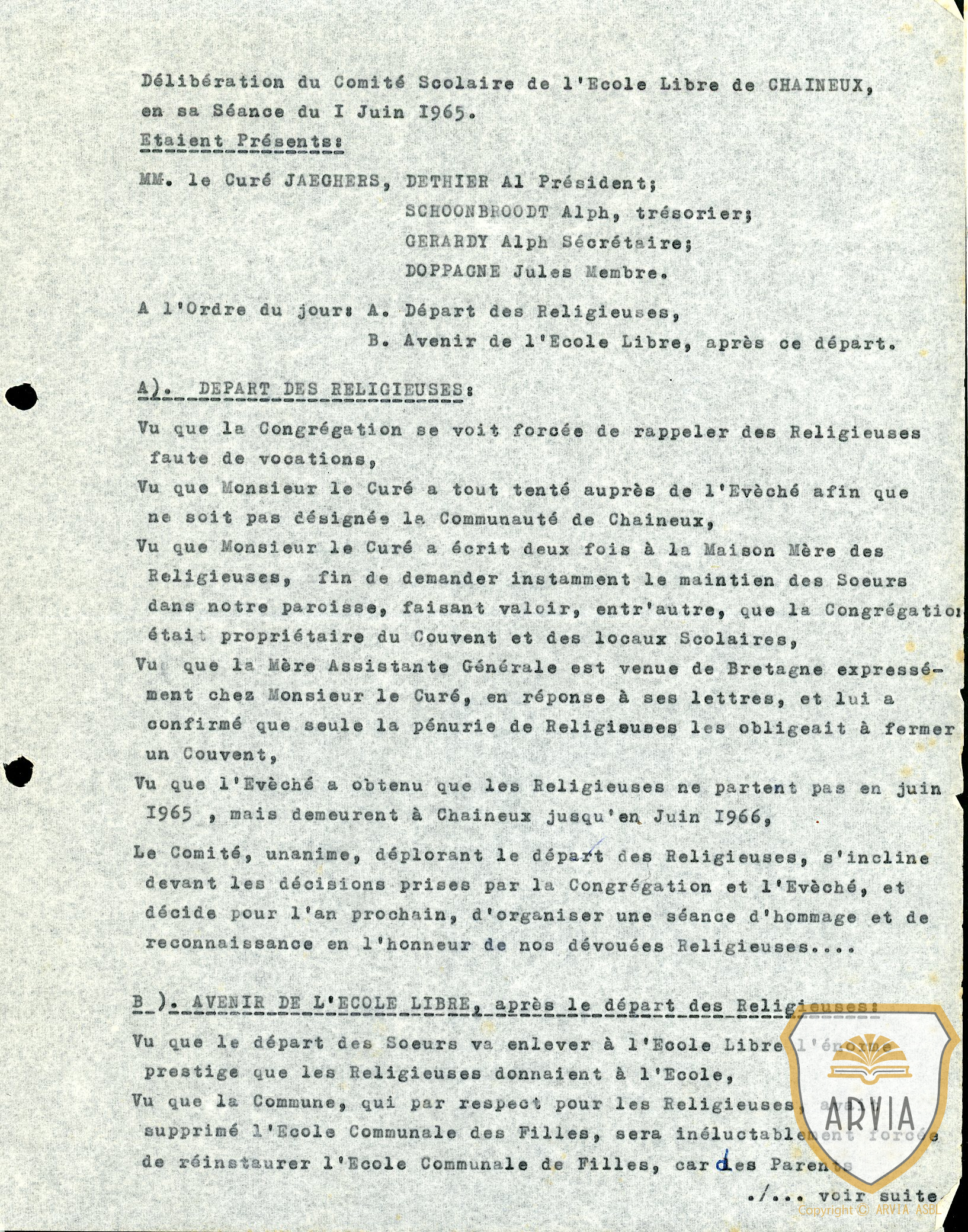 CHAINEUX -1965 – délibération du Comité Scolaire de l’école libre du village – faute de vocations… 11 février 202611 février 2026 Jean-Marie Doppagne CHAINEUX – 1965 – départ des Religieuses faute de vocations – restauration de l’école Communale de filles, d’où suppression de l’école Libre. ( 1er juin 1965 ) l’envoie de préavis est déposé.