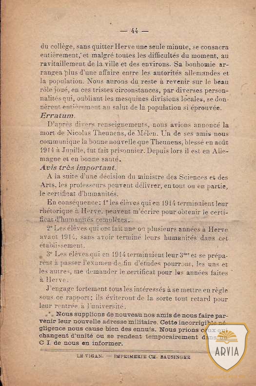 La vie du Collège depuis l’invasion de 1914, celui-ci n’a pas pu ouvrir en octobre 1914, trop près des tragiques évènements qui avaient détruit la Ville.