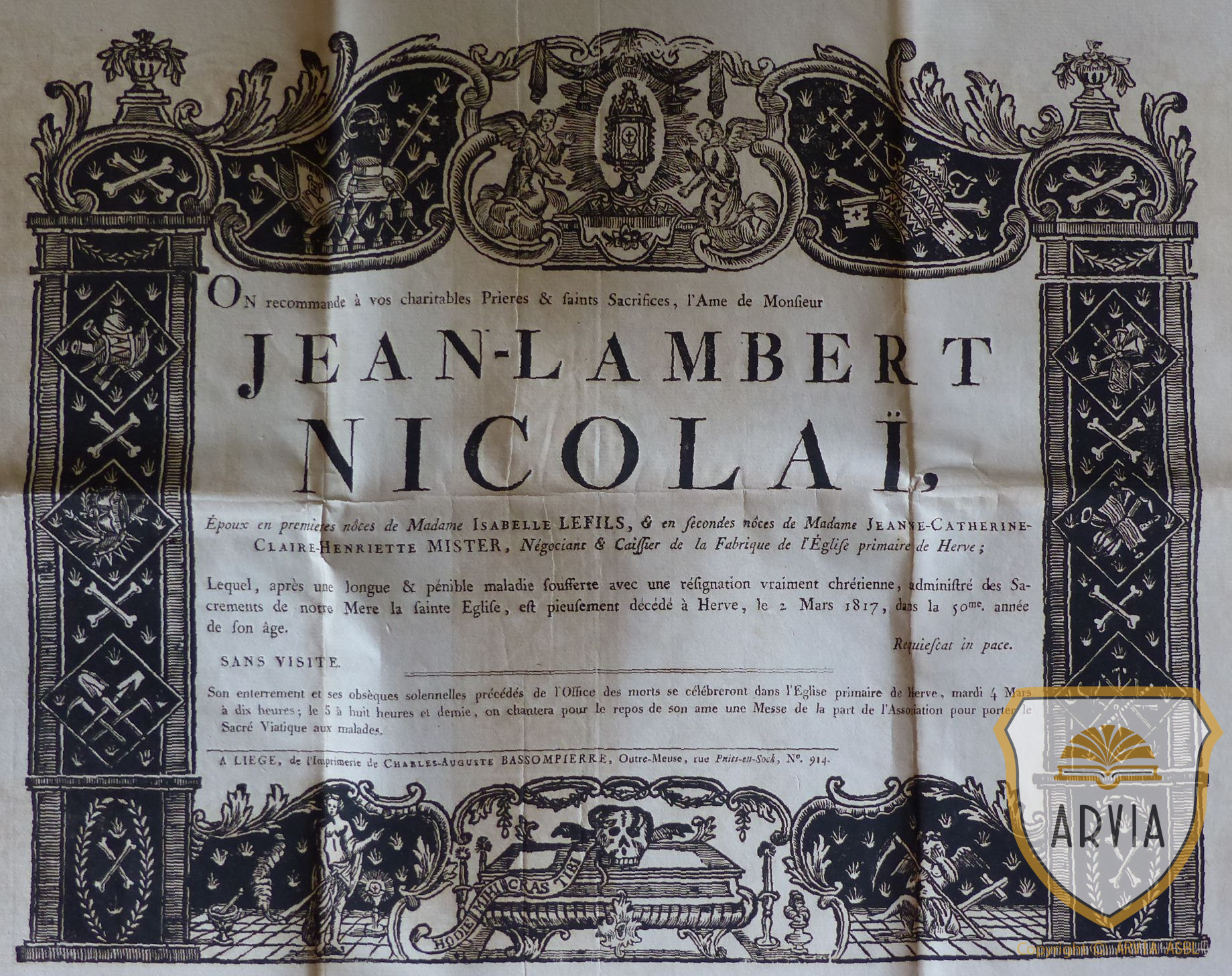 HERVE – 1817 – Jean-Lambert NICOLAÏ – Placard mortuaire 28 décembre 202528 décembre 2025 Jean-Marie Doppagne Jean – Lambert NICOLAÏ veuf en 1è noces d’Isabelle LEFILS et en 2è noces de Jeanne Catherine MISTER négociant et caissier de la Fabrique d’église primaire de Herve.