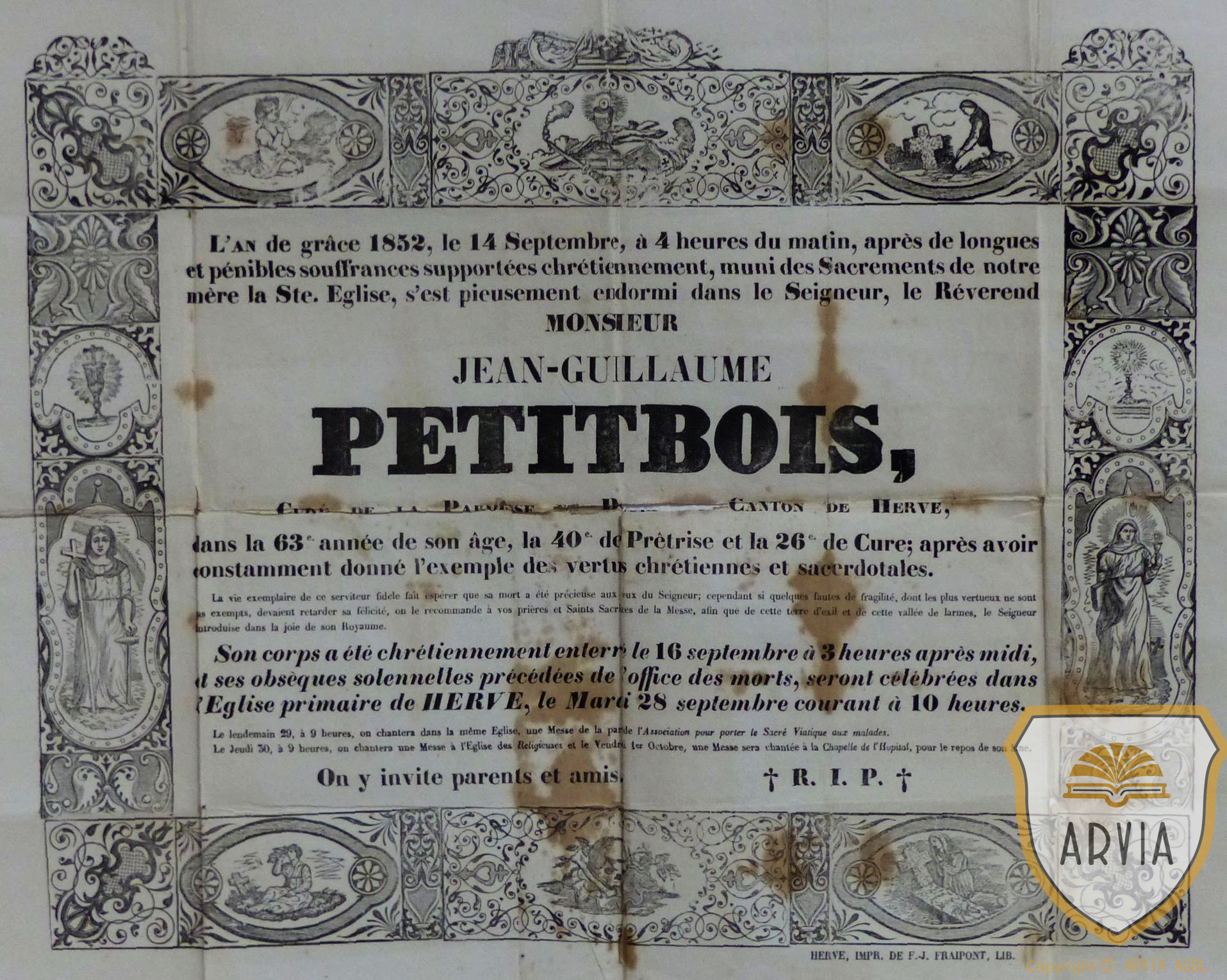 HERVE -1852 – placard de décès – Jean-Guillaume PETITBOIS curé et doyen du canton de Herve 13 mars 202613 mars 2026 Jean-Marie Doppagne Jean-Guillaume PETITBOIS sera remplacé par Warblings en décembre.