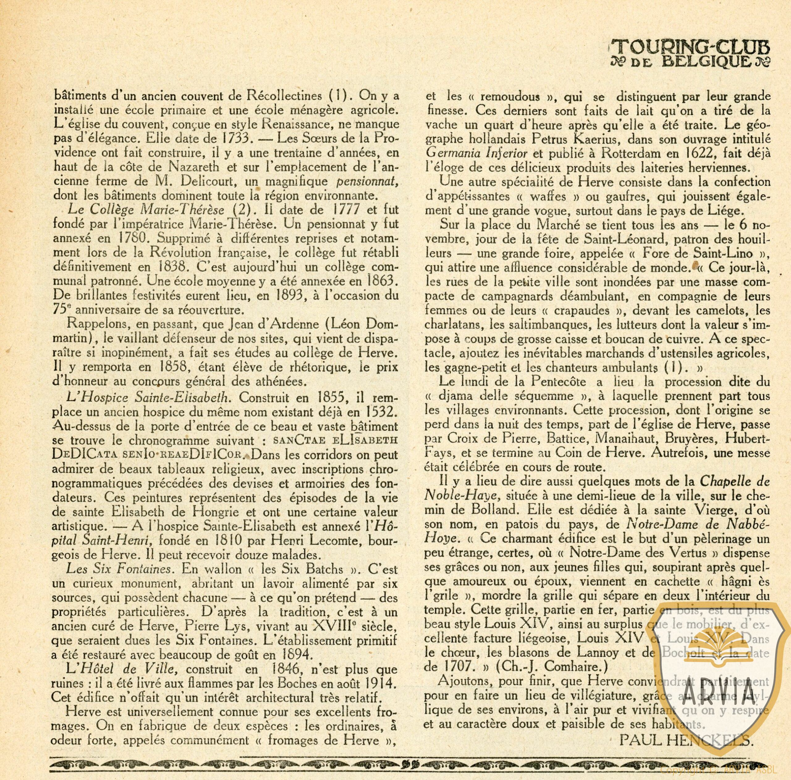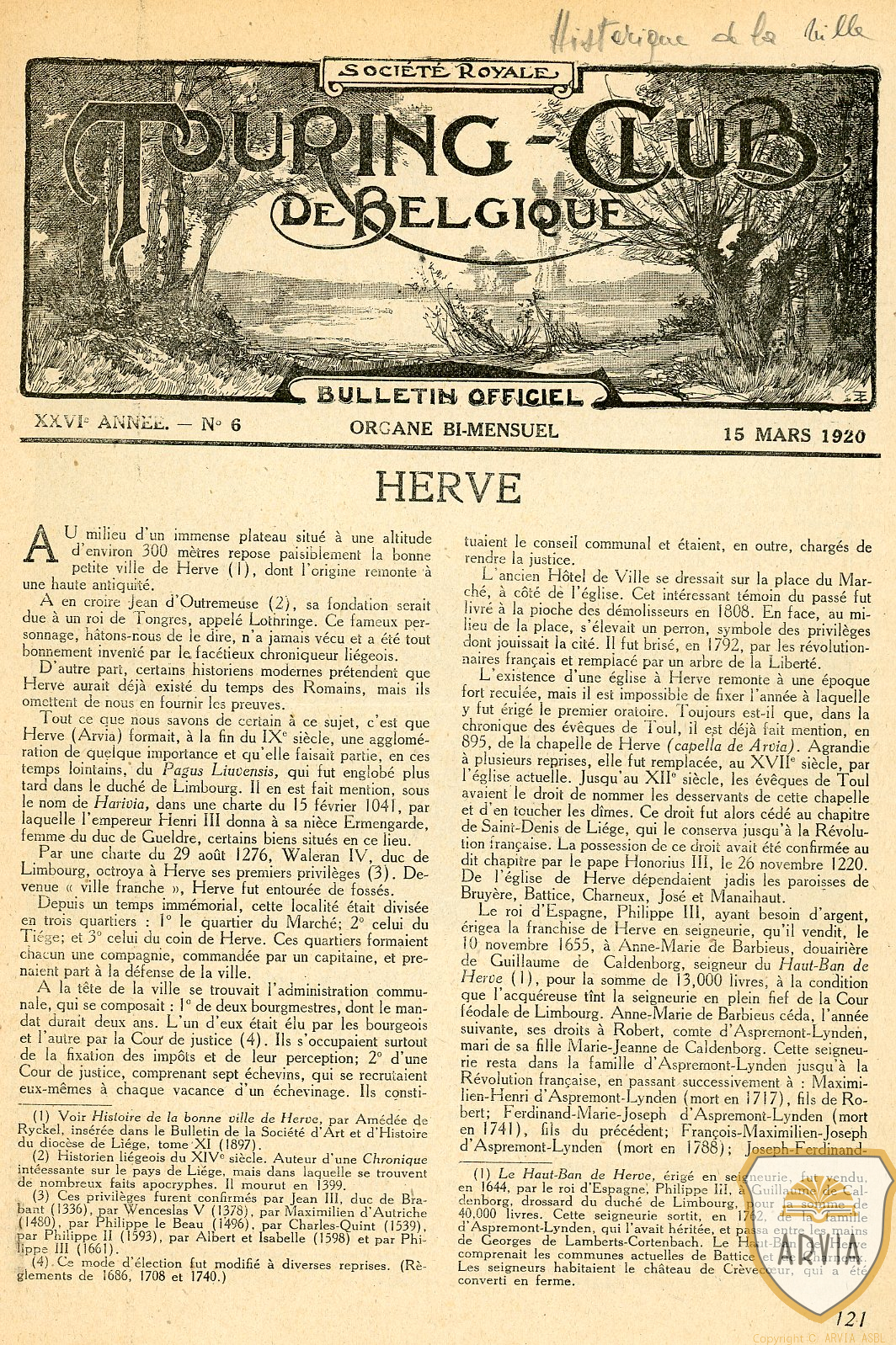 HERVE – 1920 – 3 pages de l’Historique de la ville de Herve avec la mention au IXème » ARVIA « 15 janvier 202615 janvier 2026 Jean-Marie Doppagne Dans la Revue du Touring Club de Belgique de 1920. Historique sur la Ville de Herve, dictant que au IXème siècle Herve s’appelait » ARVIA » pour la première fois !