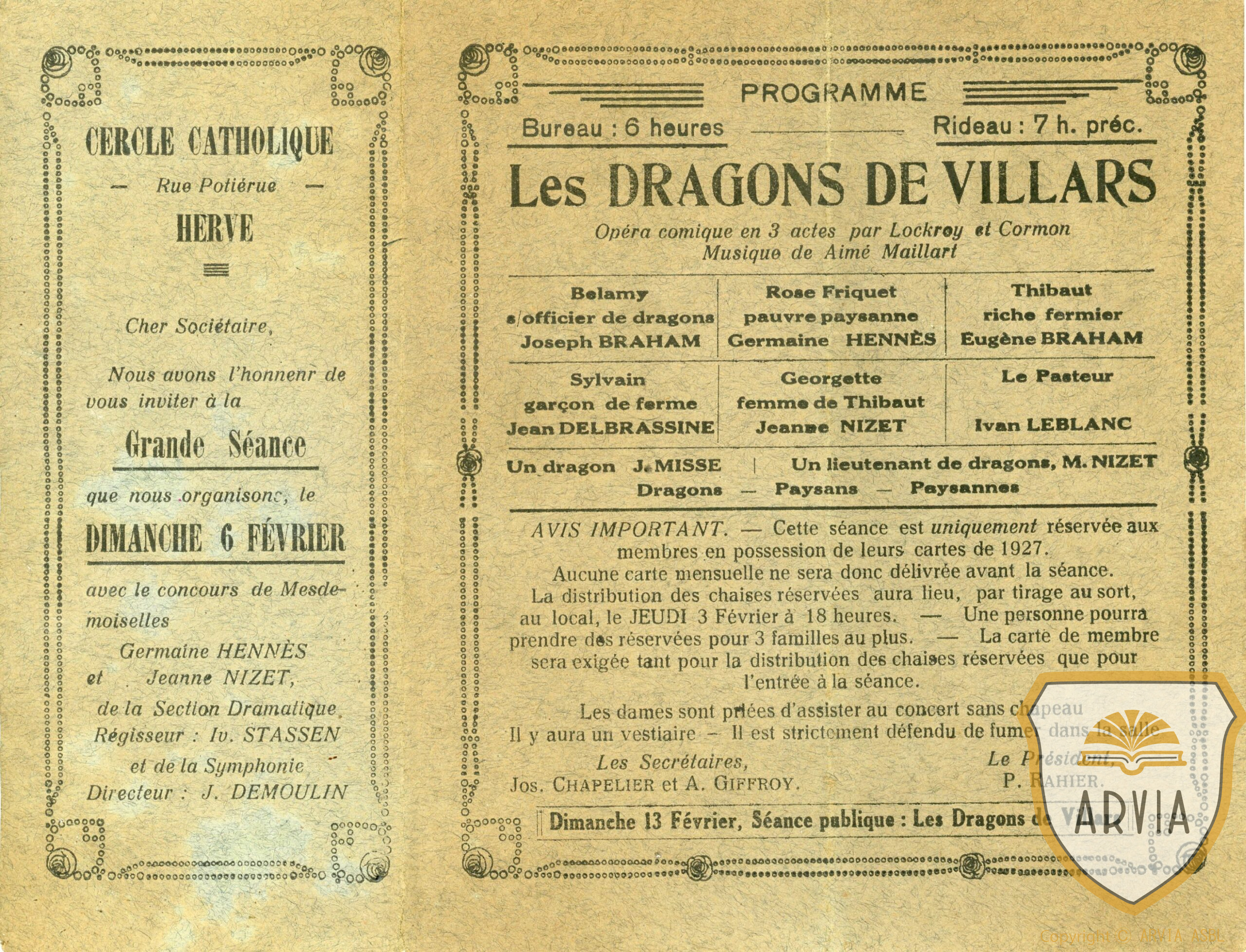 HERVE – 1927 – Cercle Catholique rue Potiérue – programme opéra comique 3 actes 9 février 2026 Jean-Marie Doppagne