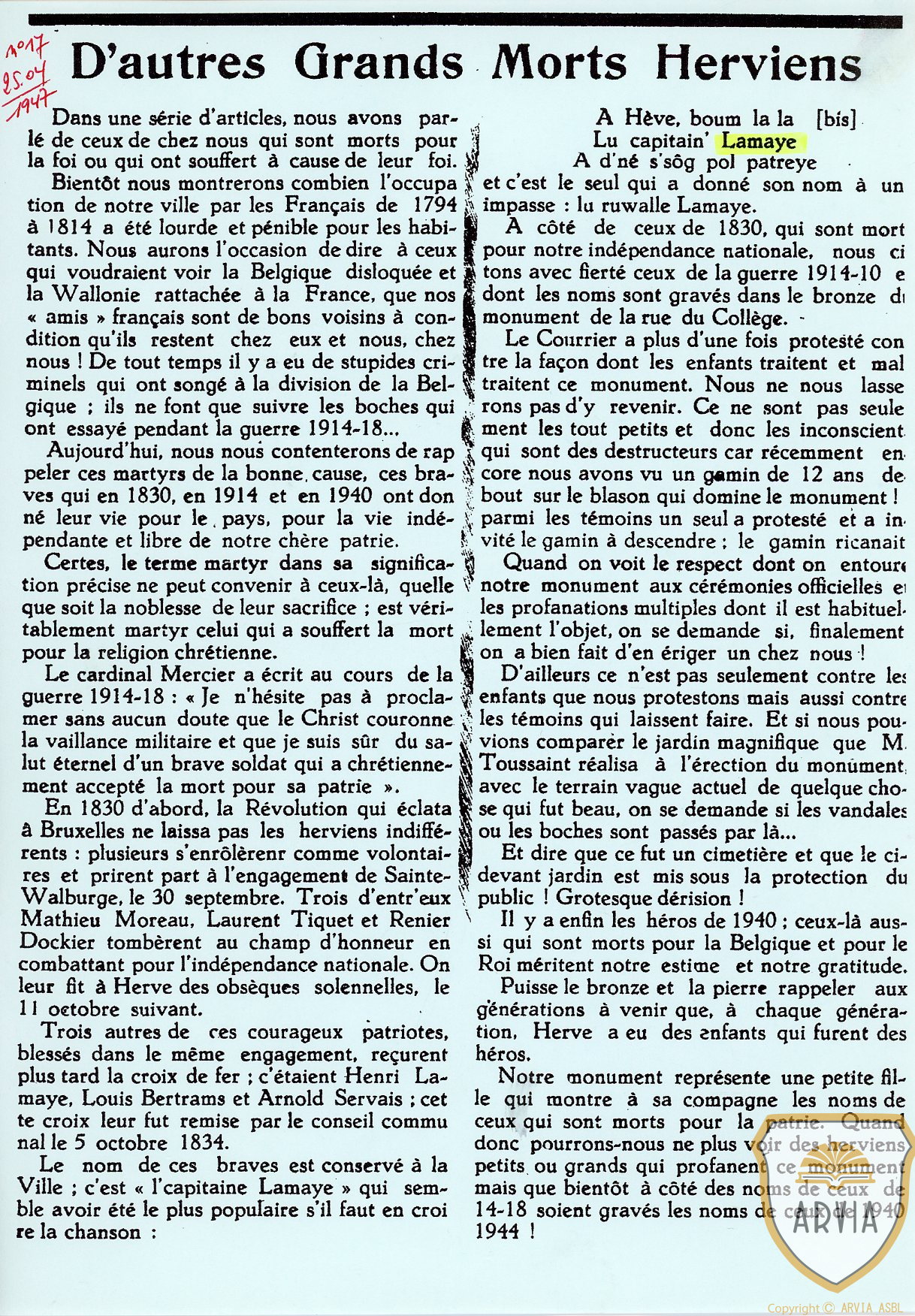 HERVE – 1947 – D’autres grands morts à HERVE – 1830 – 1914 – 1940…..C.Herve de 1947…. 14 mars 2026 Jean-Marie Doppagne