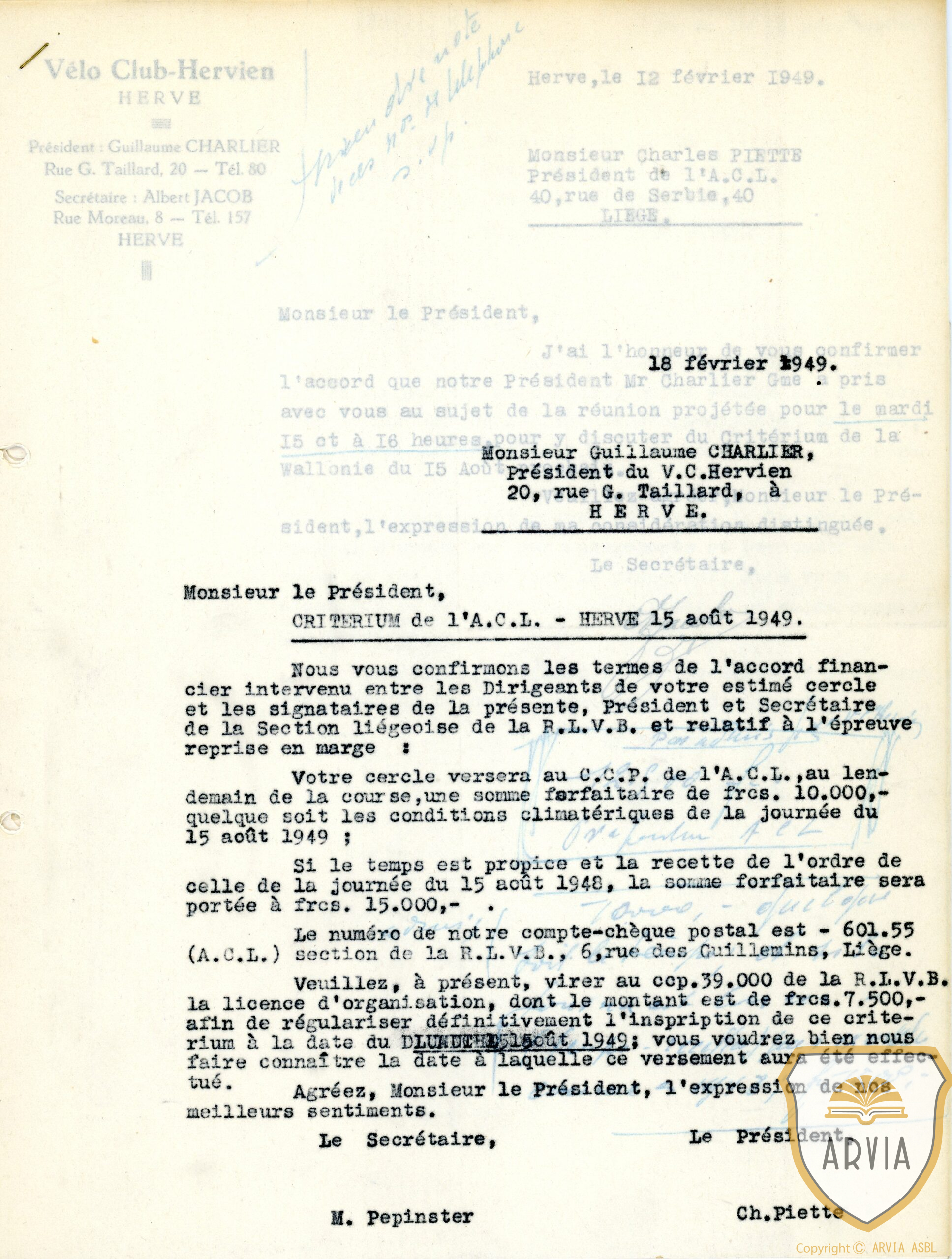 HERVE – 1949 – Critérium de Wallonie – litige quant ‘à la date de participation – correspondances 22 février 2026 Jean-Marie Doppagne