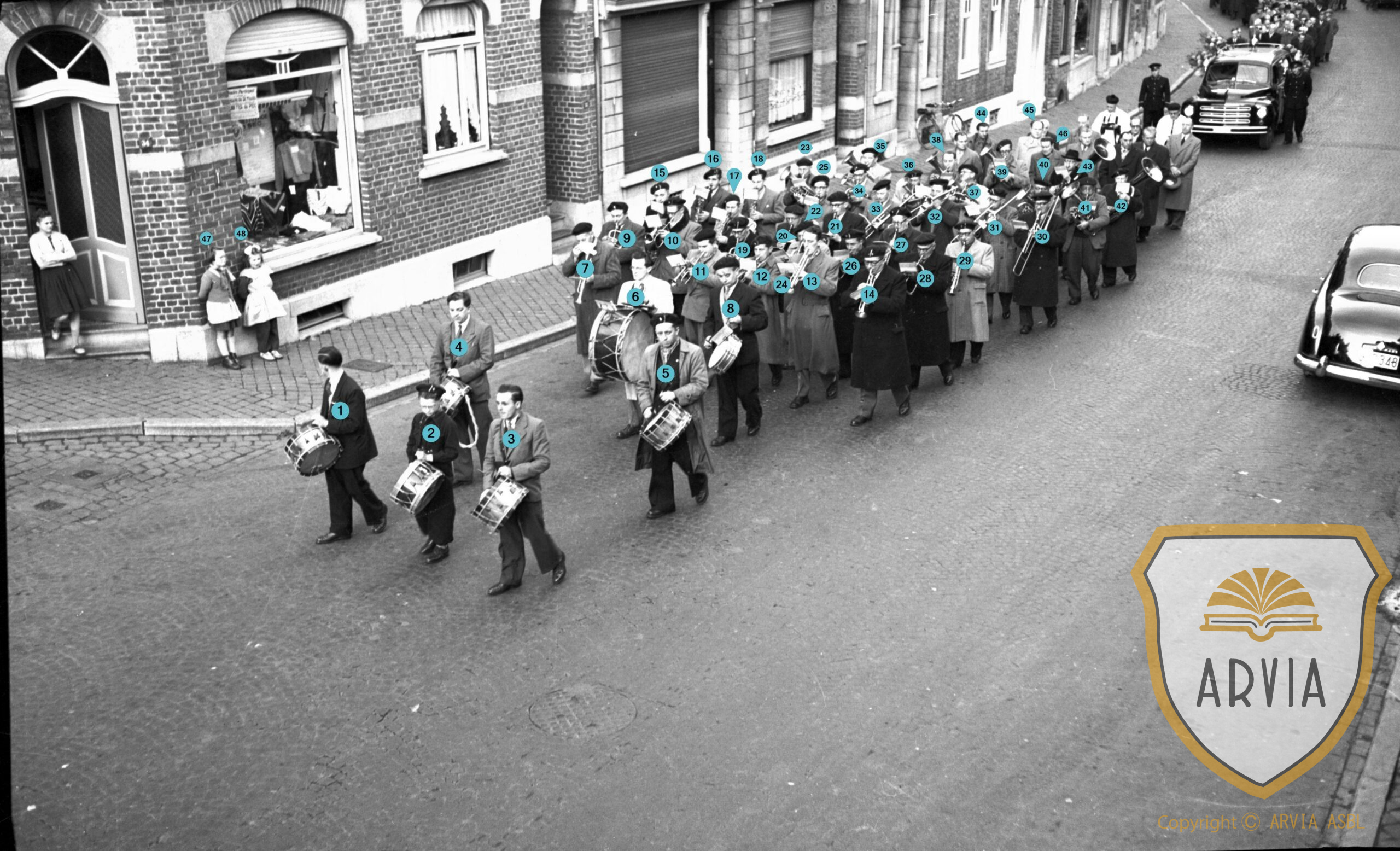 Photo 2 – La petite fille en blanc Huguette Baguette – 2, José Timmermann, 3, Joseph Lonneux, 4, Fernand Randaxhe, 5, Ernest Mathonet. 9, Jules Saive, 10, Jacques Nissen, 11, François Lejaer, 12, Roger Matelot, 13, Jules Petitjean, 14, Louis Piron, 15, peut-être Emile Doudelet ? 16, Emile Marnette, 17, Henri Englebert, 19 François Lejear, 25, Raymond Annet, 27, Roger Stassen, 30 Corneil Demoulin, 32, Jean Pirotte, 35, Martin Letesson, 42, Michel Pirotte, 43, Jean Bouché, 46, Henri Gihoul, 45, Xavier Breuer, Eugène wuidard, Georges Claessen, Joseph Levêque,