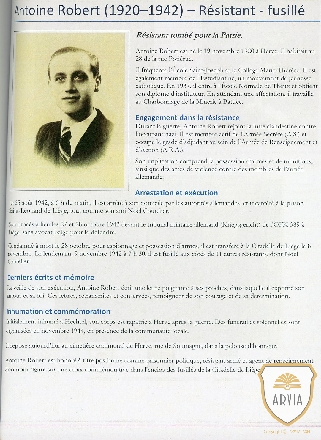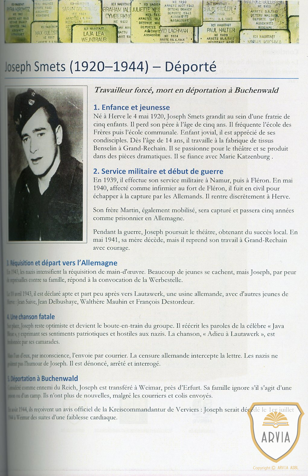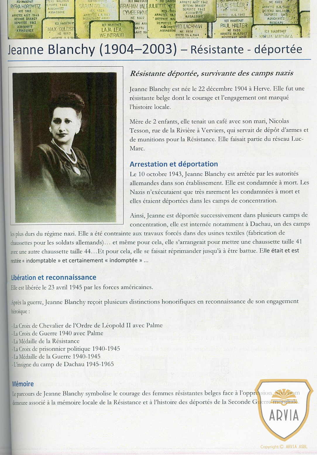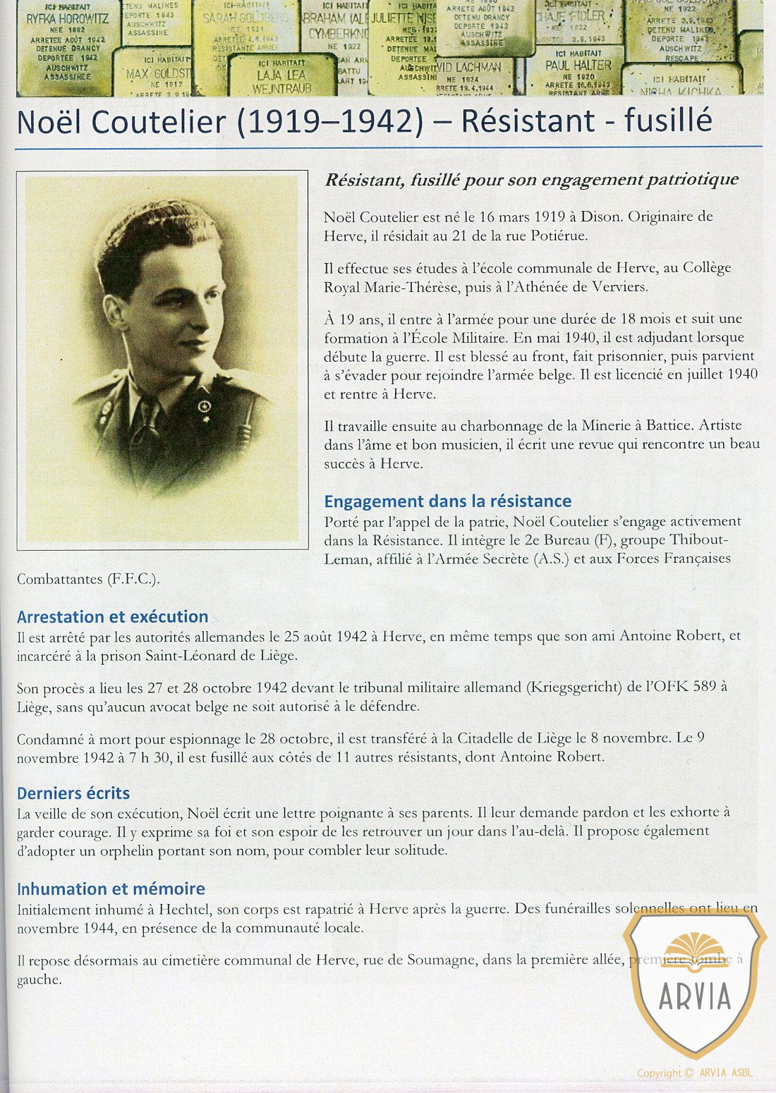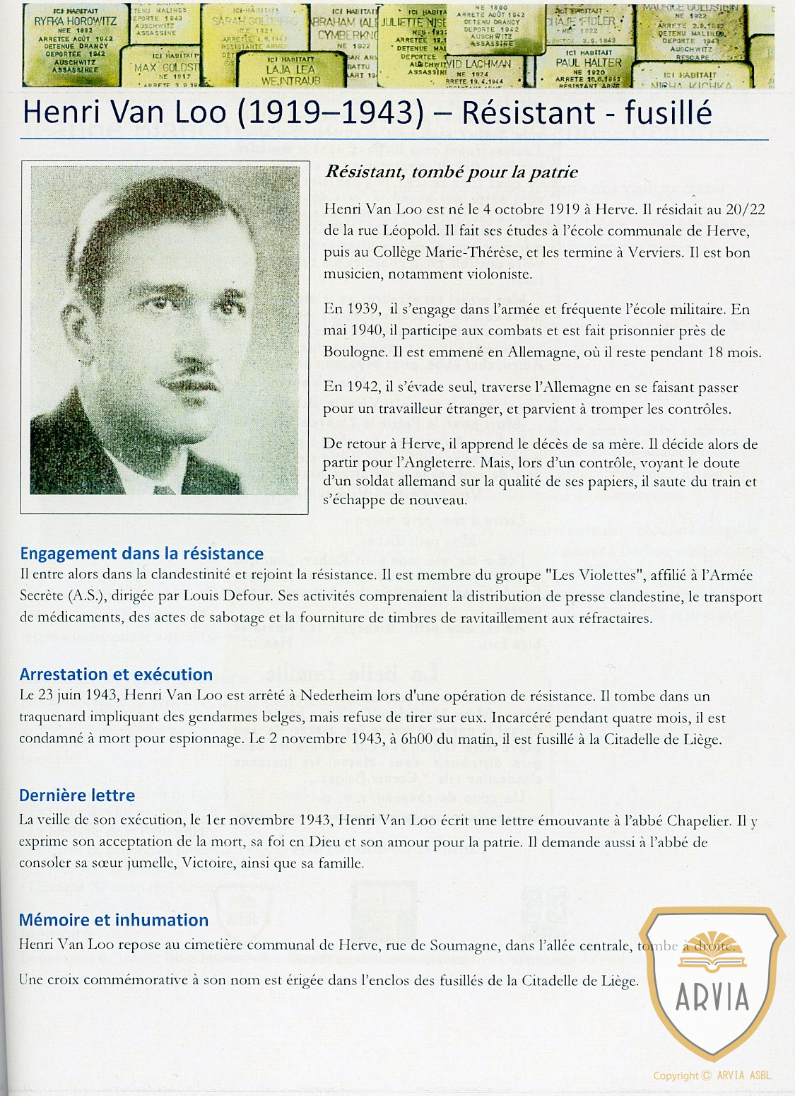 Joseph SMETS D  ( 1920-1944 ) André HOLLER ( 1921-1943 ) Jeanne BLANCHY D ( 1904-2003 ) Henri VAN LOO F ( 1919-1943 ) Noël COUTELIER F ( 1919-1942 ) Antoine ROBERT F ( 1920-1942 )