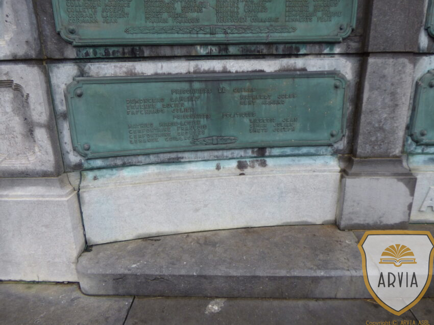 Dans la partie centrale, sous les armoiries de la Ville et les mots « MORTS POUR LA PATRIE » inscrits dans la pierre, une tête de lion tenant dans la gueule une branche de chêne, symbole de force et de solidité, et une branche de laurier, symbole de victoire et de gloire.