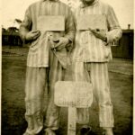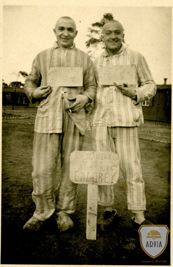 A droite, c’est mon père Emile, l’autre inconnu au bataillon; le costume rayé n’est rien d’autre qu’un pyjama et le crane rasé c’est un pari pour gagner du tabac. Lautawerk était un camp de travail où en dehors des heures de travail à l’usine les déportés pouvaient sortir et s’occuper avec les moyens dont ils disposaient. ( Emile Lorquet )